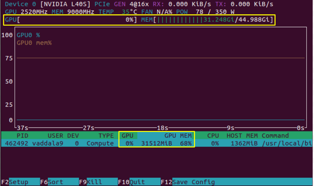In the image above, we have only loaded the model and have not yet asked a prompt which kicks off computation. As we expect, we see that the model takes considerable memory (31GB out of the possible 45GB), but the compute of the GPU is not being used. These can be seen in two places on the screen, highlighted in yellow. Note however that some applications, like JAX, artificially fill the memory of a GPU even if that memory is not needed. This can lead to an inaccurate picture of GPU utilization, and it would be good to check whether your application could be doing this.