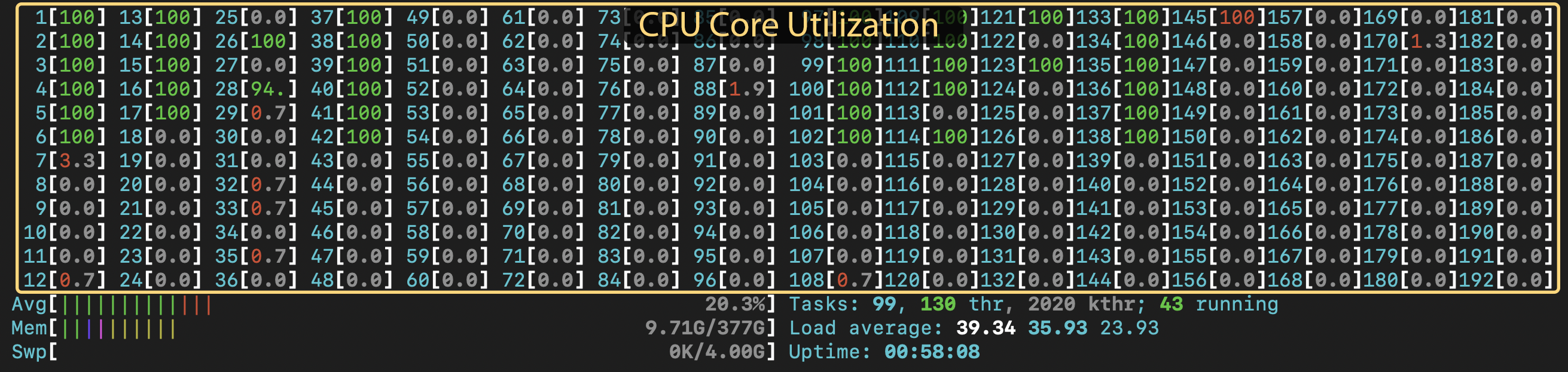 In the top half you'll see numbered bars with percentages. These represent the cores on the node. You'll see twice the number of bars as cores. This is due to hyperthreading: each physical core has two "virtual" cores. This display gives you a rough idea of how hard the cpus on the node are working. If a CPU is at 100%, it is fully utilized. If there isn't much activity, not much is going on on the node. If you are expecting multiple processes or threads to be working, and you only see one bar fill up, you have an indication that you might need to change a setting. Alternatively, maybe you haven't explicitly asked your program to use multiple cores and you expect it to use only one, but you see multiple CPUs at 100%, even when you are the only person on the node. In that case you may need to tell the package you are using how many threads or cpus to use.