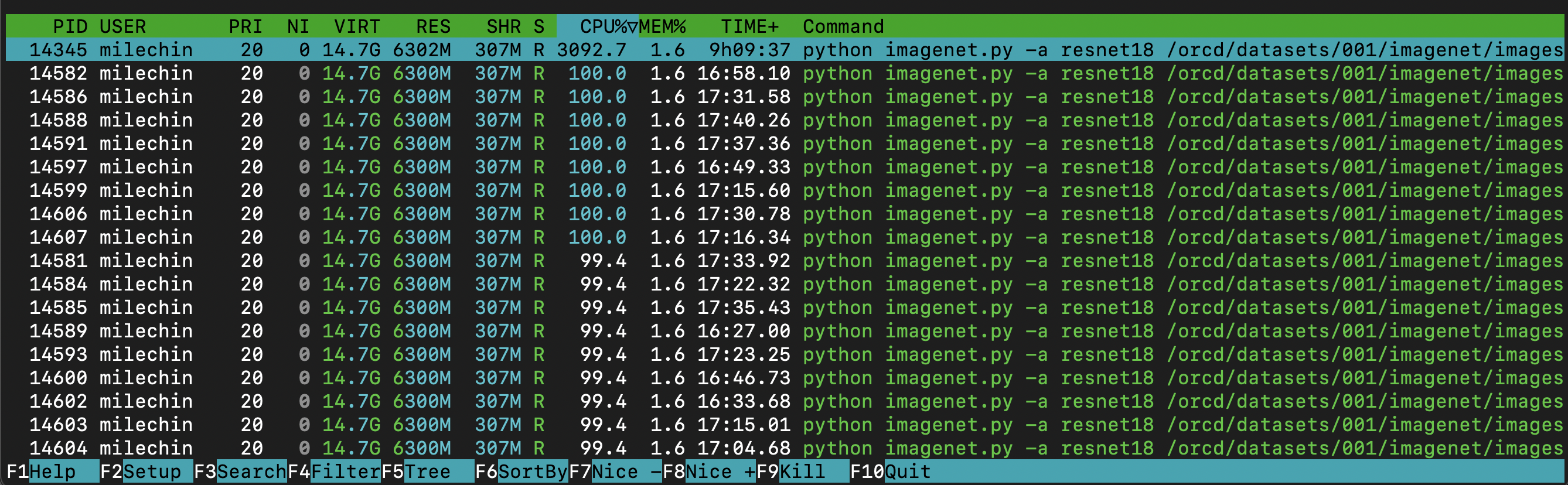 Now let's take a quick look at the bottom half. As mentioned above, this shows all of your processes and threads running on the node. You can see the PID (process ID), username (you'll only see your own processes), state, CPU utilization %, memory usage %, and the command that initiated the process, among other things. Clicking on the different headers re-sorts the list by that column, here I have it sorted by CPU%. In this case I started one Python process and that Python application created many threads. The main process happens to be at the top in this case, since I have it sorted by CPU%. When you have a multithreaded application, the CPU usage for the individual threads is included in the number for the main process. Each thread is currently using about 100% of a CPU (100% is full usage of a single CPU), so the total for the entire application is 3092%, meaning my application is using the equivalent of 30-31 full cores across all its threads. So even though I have 43 total running threads and/or processes, they aren't all using the full power of a CPU. All of the numbers on this bottom chart are instantaneous, rather than an average, but you can see the CPU% for the main task matches up somewhat with the load average above, when taking into account another user running on the node.