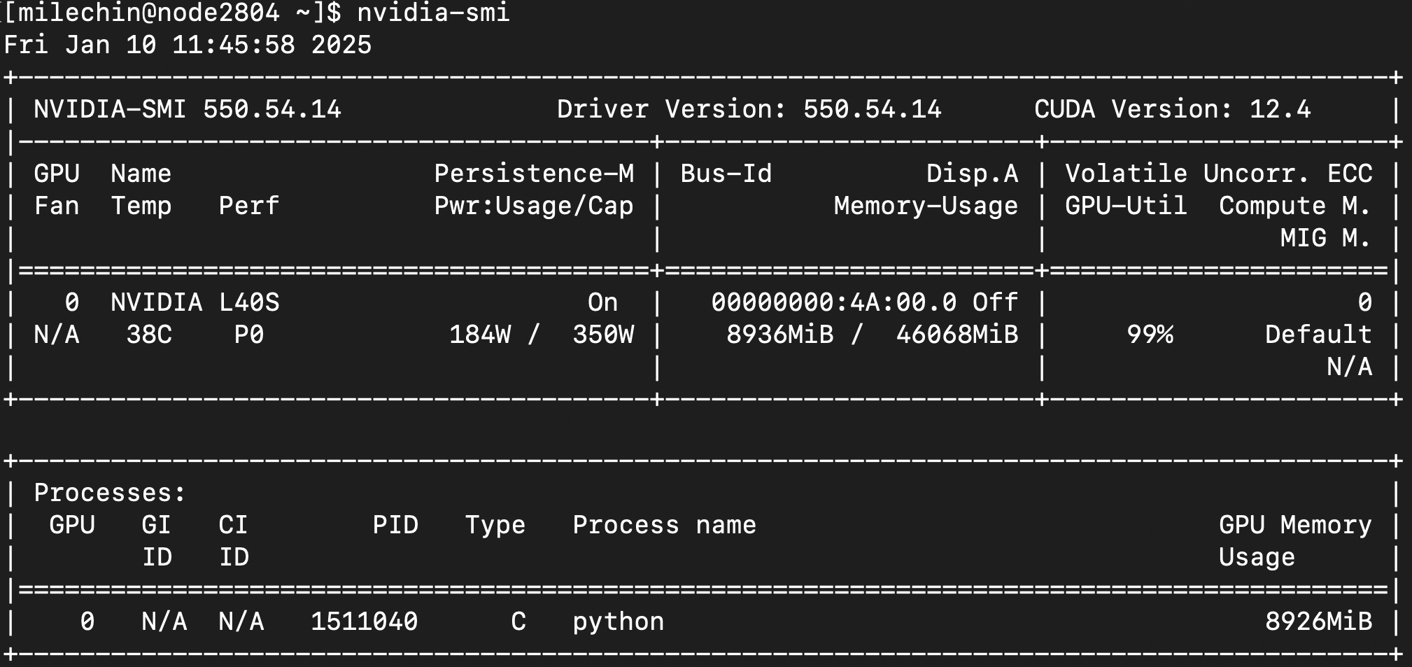 The first box, circled above, tells you about the GPU, its state, and some of its physical properties. You can see the GPU name (L40S), its current temperature (38C), and current power usage and power cap (using 184W, capped at 350W). This is more informational than anything, but knowing how much power your GPU is using might be something you want to think about, especially if you are using them often.