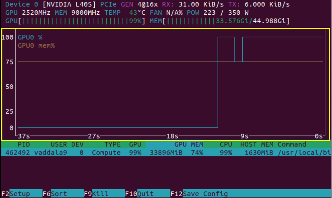 In the image above, we have only loaded the model and have not yet asked a prompt which kicks off computation. As we expect, we see that the model takes considerable memory (31GB out of the possible 45GB), but the compute of the GPU is not being used. These can be seen in two places on the screen, highlighted in yellow. Note however that some applications, like JAX, artificially fill the memory of a GPU even if that memory is not needed. This can lead to an inaccurate picture of GPU utilization, and it would be good to check whether your application could be doing this.