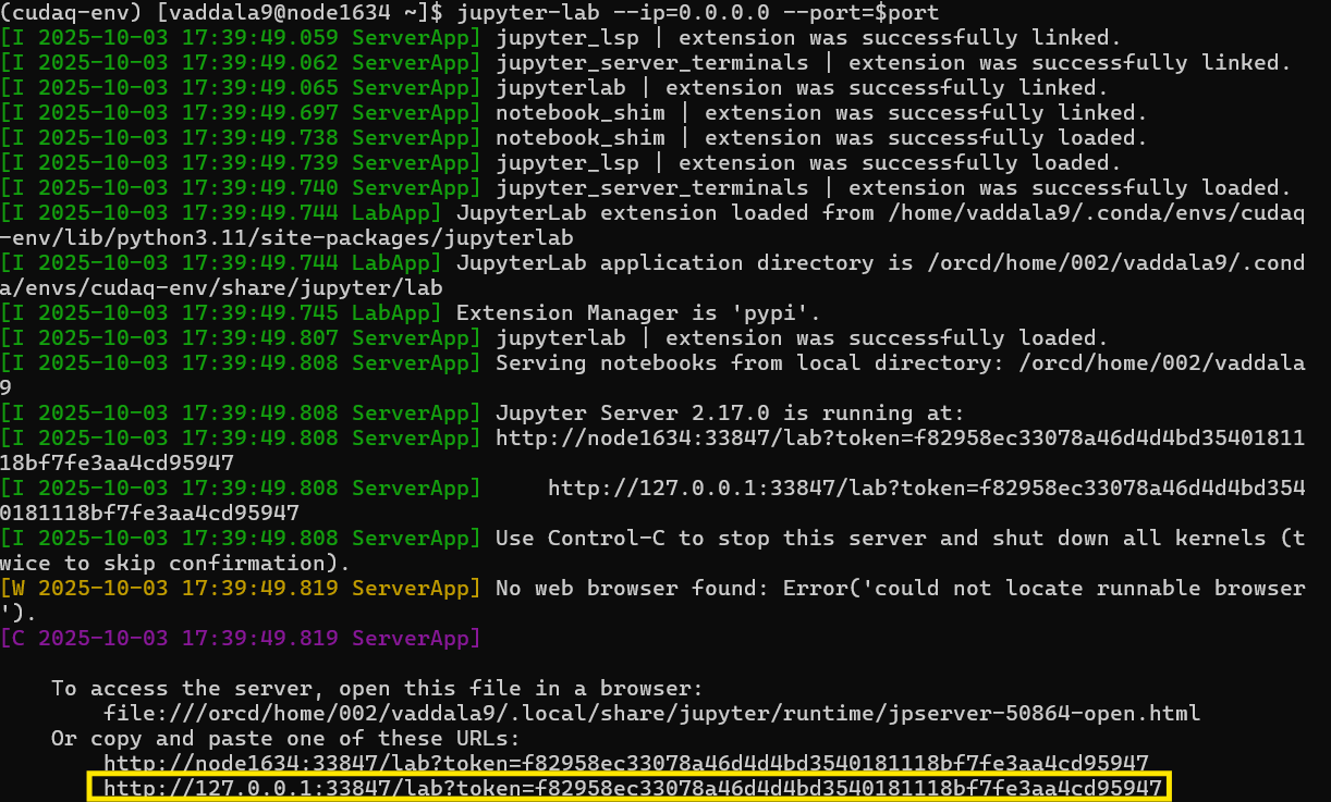 Make sure to select the second URL that is provided as outlined in yellow above. We cannot use this link right away because that node is not available from our local machine. Through "tunneling," however, we can access this node through a login node, which is accessble from our local machine.